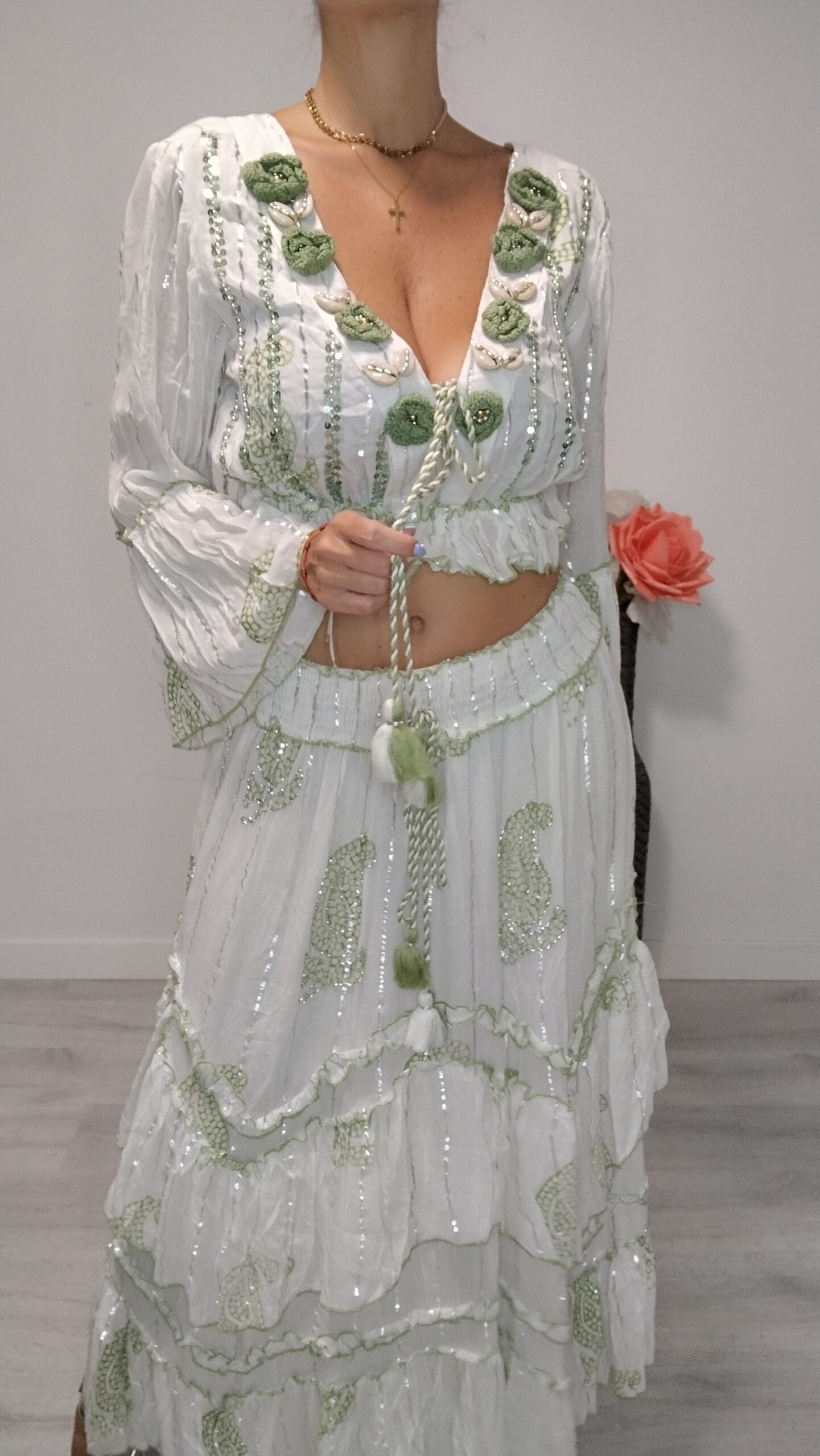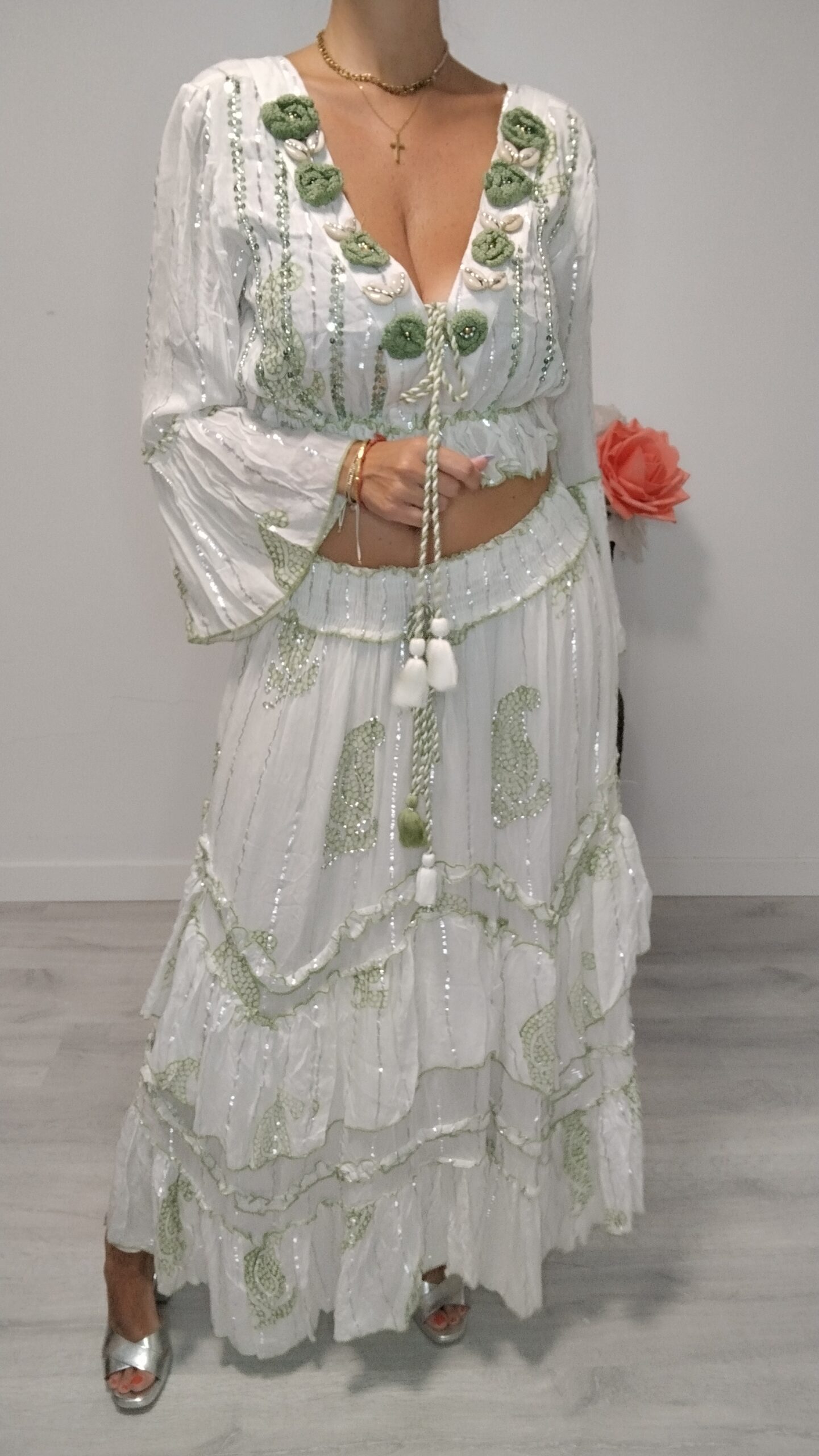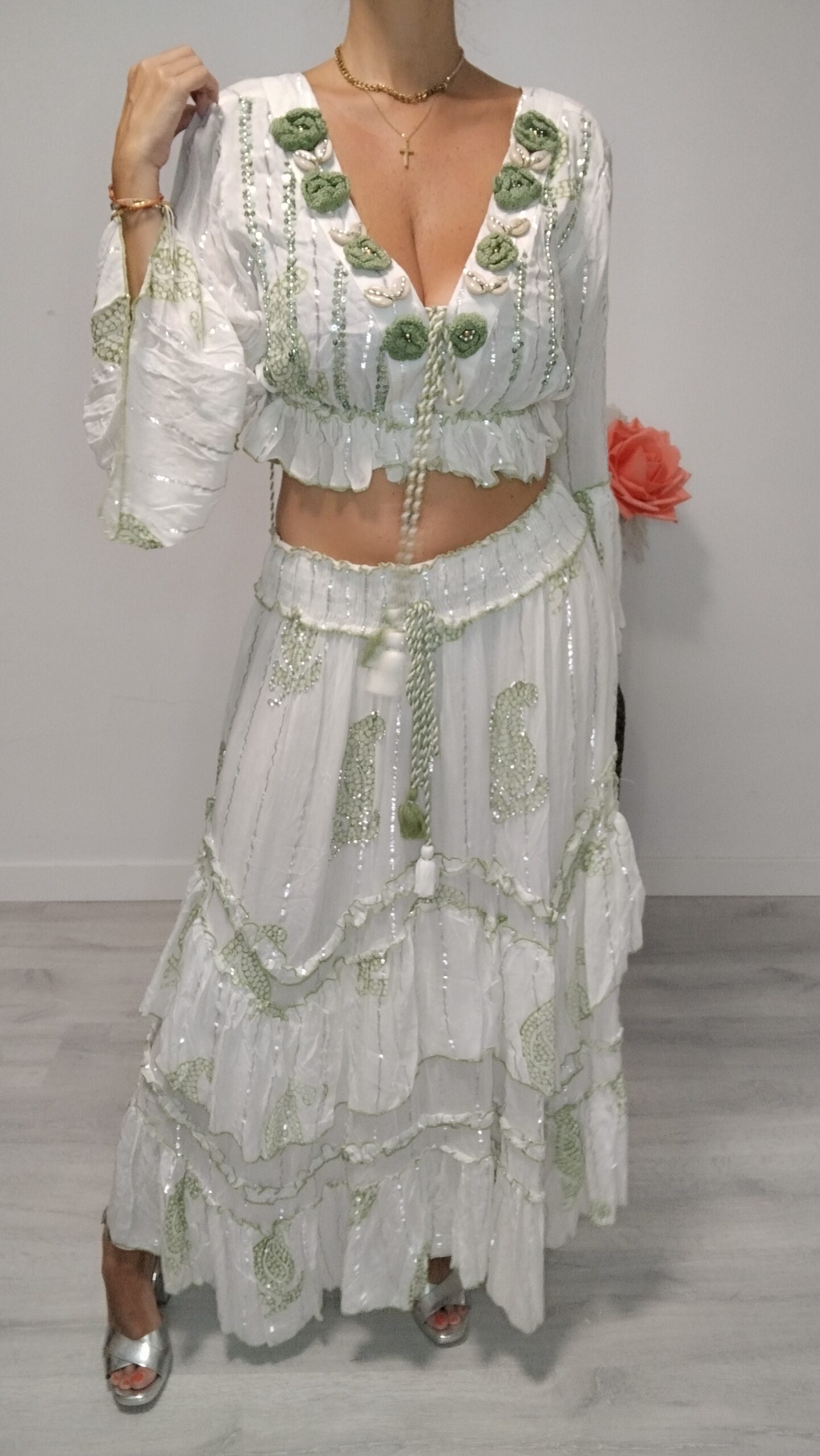Conjunto de dos piezas, falda con cintura elástica y top con conchas y lentejuelas
