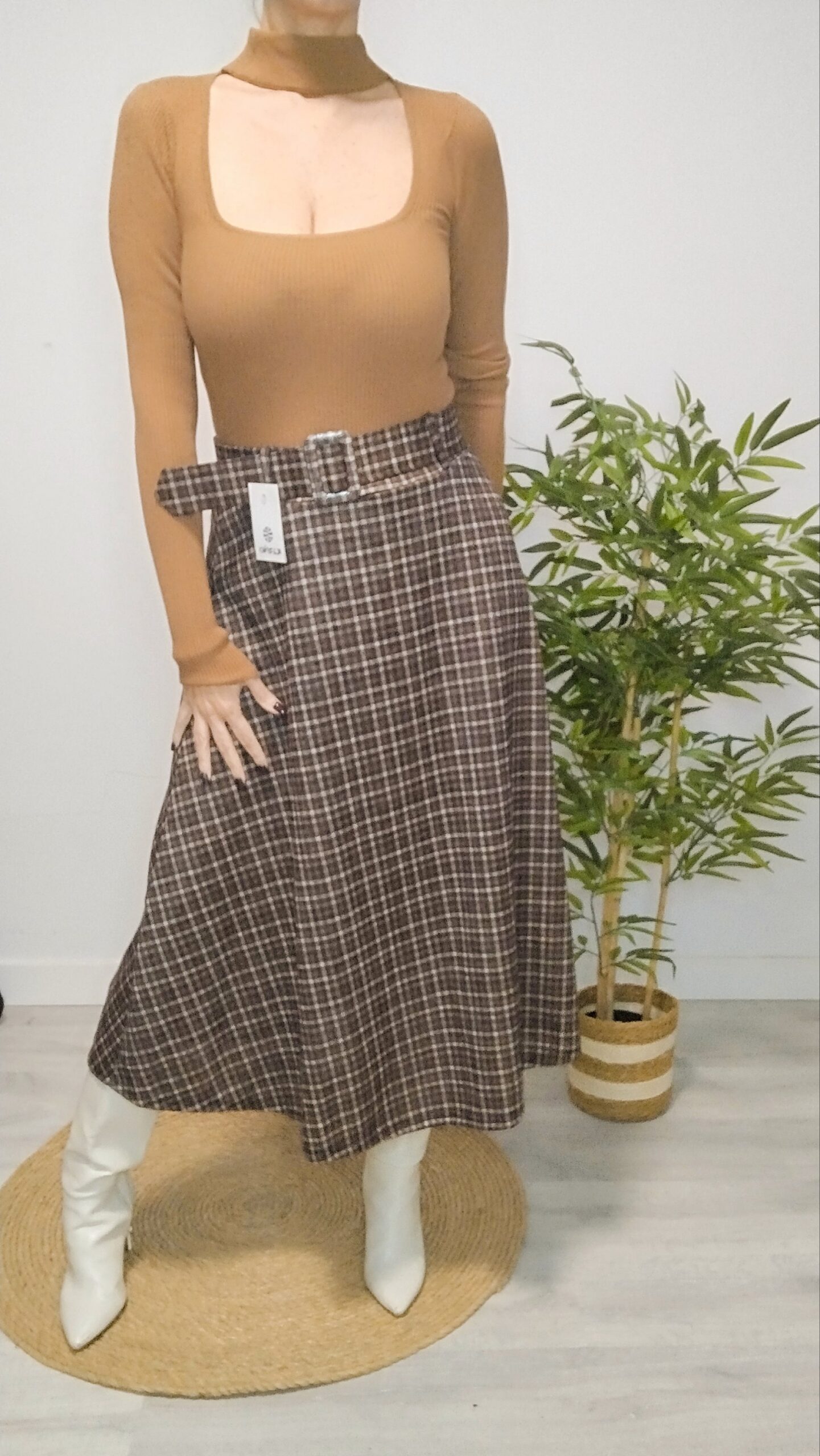 Jersey Camel de punto con apertura escote y cuello halter